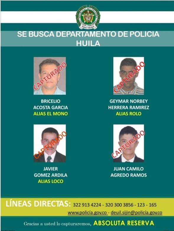 El Departamento de Policía Huila en ejecución del Plan 100 contra el microtráfico, logró en los últimos días la captura de un reconocido delincuente conocido como “Rolo”, el cual está incluido en el cartel de los más buscados, y quien hacía parte de la estructura criminal “Los Fugitivos”, desarticulada en el mes de diciembre del año anterior, quienes incurrían en los delitos de concierto para delinquir, tráfico de estupefacientes, hurto calificado – agravado y uso de menores de edad para la comisión de delitos.