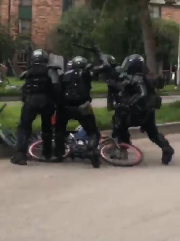 En medio de un enfrentamiento con manifestantes, y mientras las periodistas Alexandra Molina y Katy Sánchez hacían reportería de la situación, un grupo de uniformados empieza a lanzar gases y aturdidoras. En el video que grabó una de las periodistas, se ve cómo un grupo de policías se abalanzan sobre un niño que estaba en su bicicleta, lo tumban, y lo golpean en el suelo entre varios.