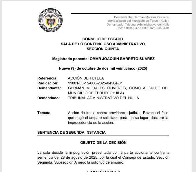 El caso se remonta al 21 de julio de 2025, cuando el alcalde de Teruel acudió a la tutela para intentar revertir una decisión del Tribunal Administrativo del Huila que, el 8 de abril de este año, dejó sin validez el Acuerdo 07 de 2024. Dicho acto administrativo autorizaba al mandatario local a gestionar operaciones de crédito por más de $3.080 millones, con plazo de ocho años, recursos destinados principalmente a la adecuación urgente de la infraestructura del Hospital San Roque, único centro asistencial de primer nivel en el municipio.