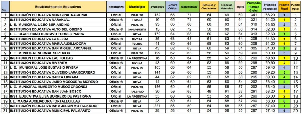 Aunque aún no se conoce un ranking oficial, los expertos ya publican resultados. La Institución Educativa Municipal Nacional -Jornada 2- de Pitalito, ocupó el primer puesto en el podio de colegios oficiales del Departamento. Del ente territorial Huila, la I.E. El Naranjal (Timaná) se ubicó en el primer lugar.