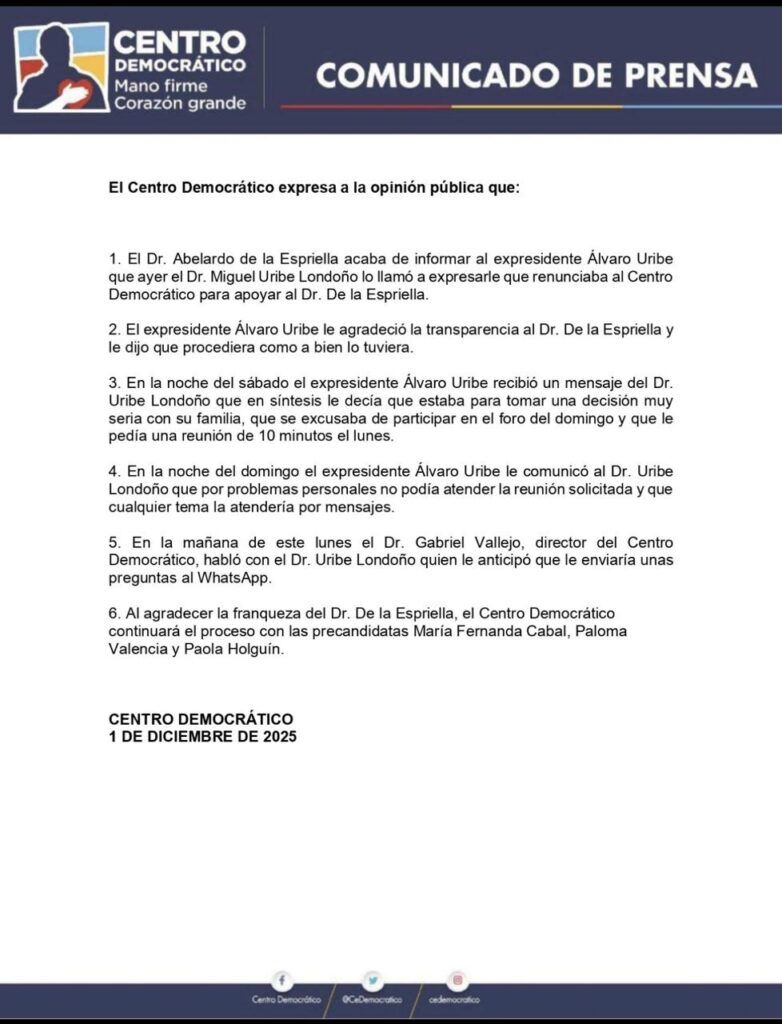 En la noche del domingo 30 de noviembre, la tensión llegó a su punto final. Aunque la determinación no se hizo pública de inmediato, las directivas del Centro Democrático tomaron la decisión de excluir a Uribe Londoño del proceso. El anuncio se formalizó en un comunicado emitido en la mañana del lunes.