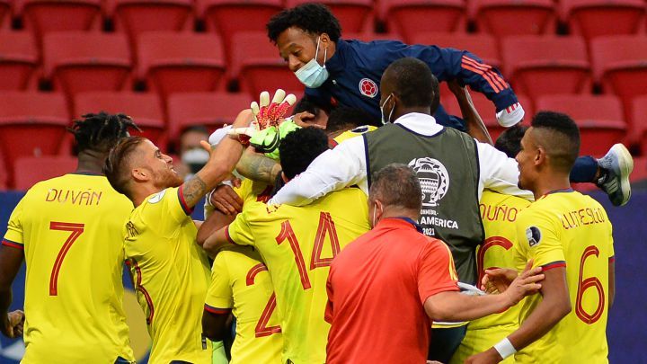 Los jugadores de Colombia festejan la clasificación a semifinales de la Copa América Brasil 2021.