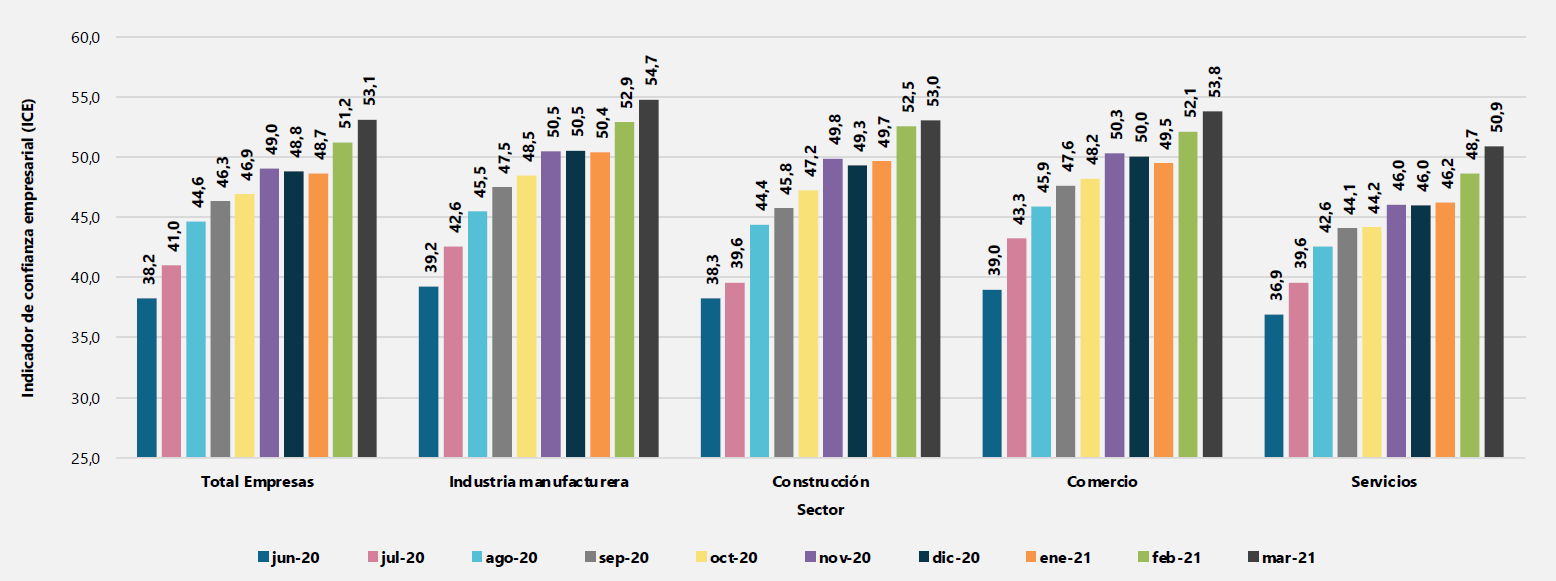 Por sectores, la industria manufacturera es la que mejor ICE mostró, siendo de 54,7, teniendo un incremento de 4,3% en lo corrido del primer trimestre de 2021, cuando en enero se encontraba en 50,4%, presentando en ese momento un leve descenso de 0,1% frente a diciembre del año anterior.