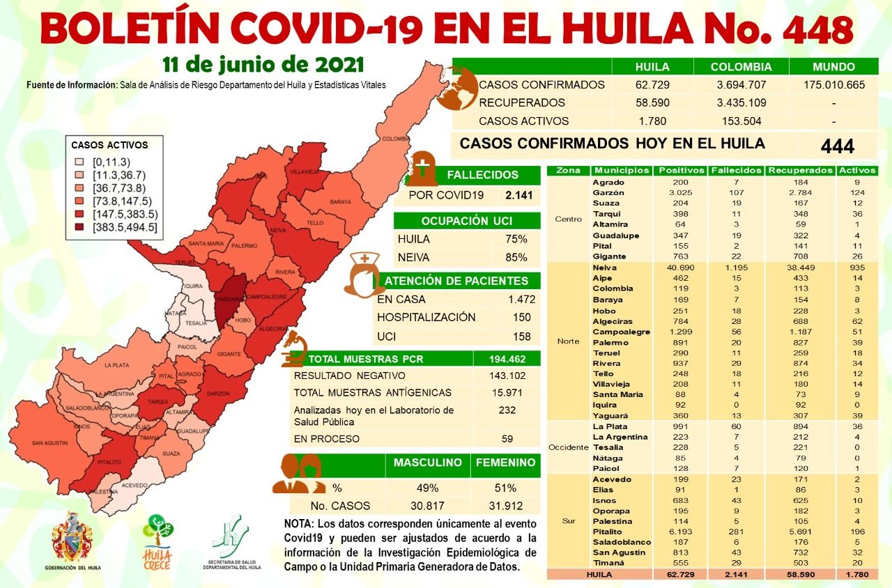 La Sala de Análisis del Riesgo confirmó para este viernes 444 casos positivos de Covid19, distribuidos en 22 municipios: 321 casos en Neiva, 28 en Pitalito, 18 en Garzón, 17 en Algeciras, 9 en Campoalegre, 8 en San Agustín, 7 en Palermo, 7 en Villavieja, 5 en Rivera, 3 en Gigante, 3 en La Argentina, 3 en Suaza, 2 en Baraya, 2 en El Pital, 2 en Santa María, 2 en Tello, 2 en Yaguará, 1 en El Agrado, 1 en Aipe, 1 en Guadalupe, 1 en Paicol y 1 en Timaná.