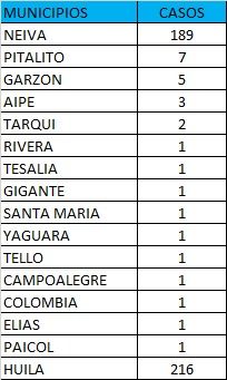 189 en la ciudad de Neiva, 7 en Pitalito, 5 en Garzón, 3 en Aipe, 2 en Tarqui, 1 en Rivera, 1 en Tesalia, 1 en Gigante, 1 en Santa María, 1 en Yaguará, 1 en Tello, 1 en Campoalegre, 1 en Colombia, 1 en Elías y 1 en Paicol.