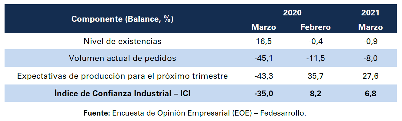 El incremento en la confianza industrial respecto a marzo de 2020 se debe a un incremento de 70,9 pps en el indicador de expectativas de producción para el próximo trimestre, a un aumento de 37,1 pps en el volumen actual de pedidos y a que el nivel de existencias se redujo 17,4 pps.