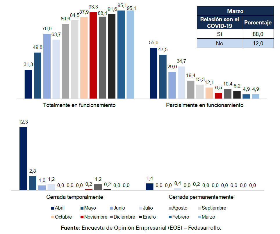En marzo, respecto al estado de operación de la empresa, el 95,1% de las firmas encuestadas no presentó una afectación en su funcionamiento, el 4,9% operó parcialmente y ninguna presentó un cierre temporal o permanente. De las empresas que contaron con algún grado de afectación en su funcionamiento, el 88% afirmó que este tenía relación con la covid-19.