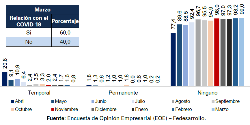 Entre tanto, la proporción de empresas que prevé un cierre permanente se mantuvo igual. De las empresas que prevén afectar su operación, en marzo el 60,0% afirmó que esta decisión tiene relación con el Covid-19.