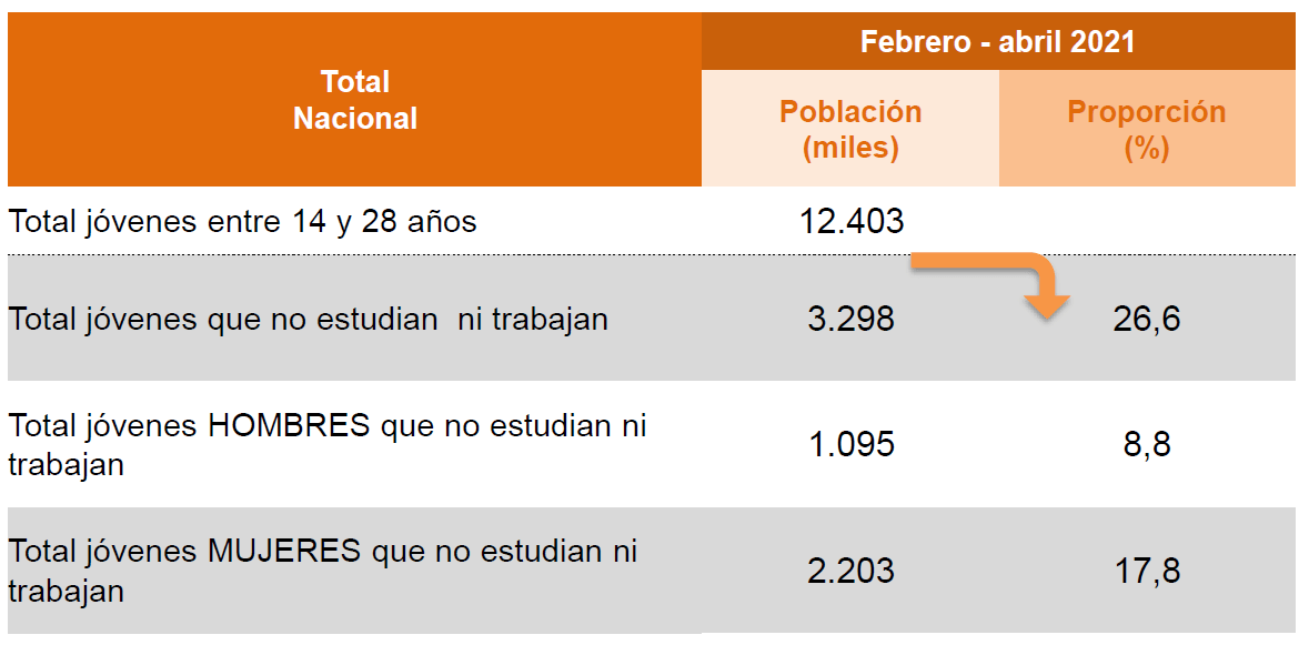 Según el Dane, el 26,6% de los colombianos entre los 14 y 28 años estaban en esa situación entre febrero y abril de 2021, algo más de tres millones de personas, entre hombres y mujeres. Los jóvenes hombres que no estudian ni trabajan representan el 8,8% (1’095.000 personas), mientras que por el lado de las mujeres son el 17,8% (2’203.000 personas). Entre los dos sexos dentro de esta categoría de edad, las mujeres representan el 66,8% y los hombres el 33,2%.