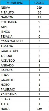 La Sala de Análisis del Riesgo del Huila confirmó 359 resultados positivos de Covid19, los casos se distribuyen así: 269 en Neiva, 26 en Pitalito, 11 en Garzón, 9 en Colombia, 7 en Aipe, 7 en Isnos, 6 en Tesalia, 5 en Campoalegre, 5 en Timaná, 2 en Guadalupe, 2 en Tarqui, 1 en Acevedo, 1 en Agrado, 1 en Baraya, 1 en Elías, 1 en Gigante, 1 en Hobo, 1 en Palermo, 1 en Palestina, 1 en Suaza y 1 en Tello.