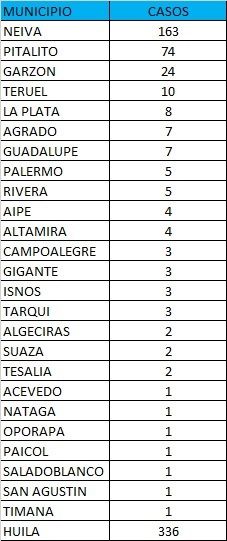 De acuerdo con el informe epidemiológico los casos se distribuyen así: 163 casos en Neiva, 74 en Pitalito, 24 en Garzón, 10 en Teruel, 8 en La Plata, 7 en El Agrado, 7 en Guadalupe, 5 en Palermo, 5 en Rivera, 4 en Aipe, 4 en Altamira, 3 en Campoalegre, 3 en Gigante, 3 en Isnos, 3 en Tarqui, 2 en Algeciras, 2 en Suaza, 2 en Tesalia, 1 en Acevedo, 1 en Nátaga, 1 en Oporapa, 1 en Paicol, 1 en Saladoblanco, 1 en San Agustín y 1 en Timaná.