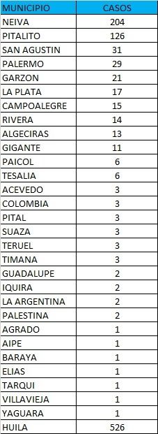 La Sala de Análisis del Riesgo confirmó 526 casos nuevos de contagio del virus SarsCov2, distribuidos así: 204 casos en Neiva, 126 en Pitalito, 31 en San Agustín, 29 en Palermo, 21 en Garzón, 17 en La Plata, 15 en Campoalegre, 14 en Rivera, 13 en Algeciras, 11 en Gigante, 6 en Paicol, 6 en Tesalia, 3 en Acevedo, 3 en Colombia, 3 en El Pital, 3 en Suaza, 3 en Teruel, 3 en Timaná, 2 en Guadalupe, 2 en Íquira, 2 en La Argentina, 2 en Palestina, 1 en El Agrado, 1 en Aipe, 1 en Baraya, 1 en Elías, 1 en Tarqui, 1 en Villavieja y 1 en Yaguará.