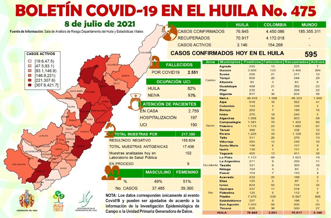 De acuerdo con el informe 2.759 personas diagnosticadas con el virus se encuentran en aislamiento preventivo, 3.146 casos se reportan como activos, el departamento acumula 76.845 casos de los cuales se han recuperado 70.917.