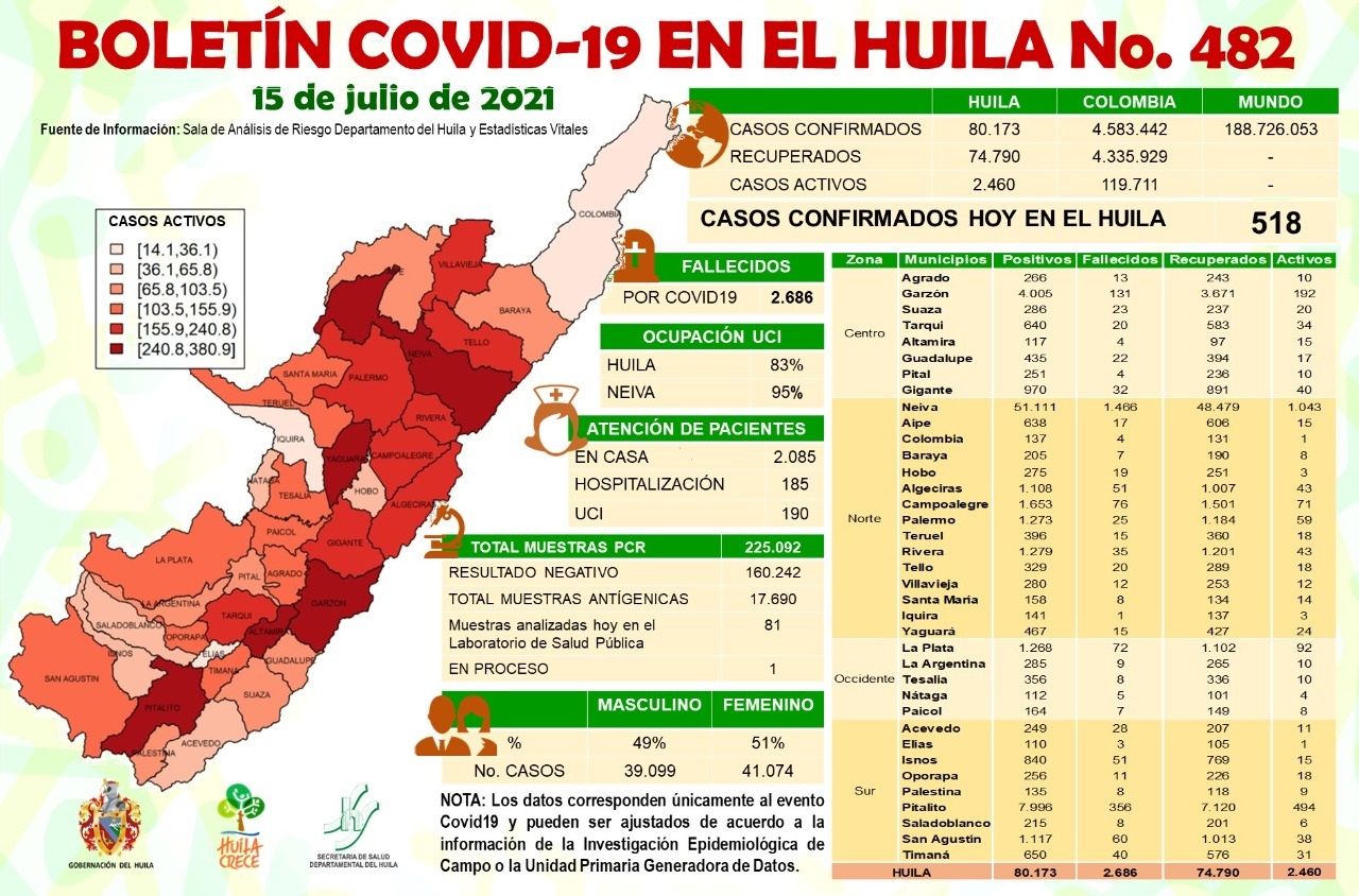 La Sala de Análisis del Riesgo confirmó 518 casos nuevos de contagio del virus SarsCov2, distribuidos así: 227 casos en Neiva, 121 en Pitalito, 36 en Garzón, 15 en Campoalegre, 13 en Palermo, 12 en Gigante, 12 en La Plata, 10 en Algeciras 10 en Rivera, 9 en Aipe, 6 en Santa María, 6 en Suaza, 6 en Tello, 4 en Acevedo, 4 en San Agustín, 4 en Timaná, 3 en Agrado, 3 en Isnos, 3 en La Argentina, 3 en Saladoblanco, 3 en Tarqui, 2 en Nátaga, 1 en Altamira, 1 en Elías, 1 en Hobo, 1 en Teruel, 1 en Tesalia y 1 en Villavieja.