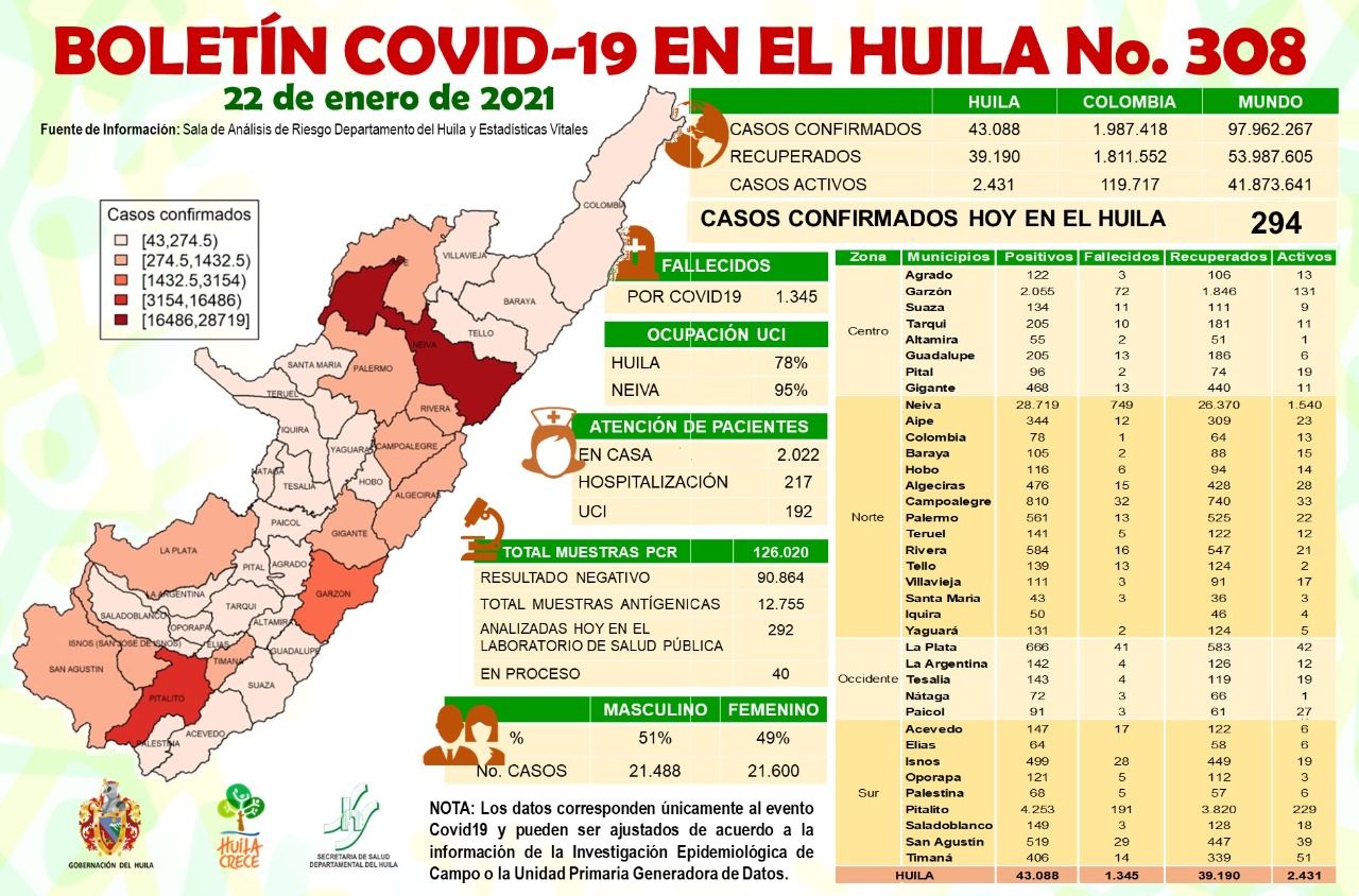 La Sala de Análisis del Riesgo del Huila confirmó 294 resultados positivos de Covid19, distribuidos así: