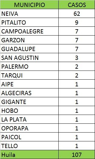 La Sala de Análisis del Riesgo para el evento covid-19 confirma 107 casos en 16 municipios distribuidos así: 62 casos en la ciudad de Neiva, 9 en Pitalito, 7 en Campoalegre, 7 en Garzón, 7 en Guadalupe, 3 en San Agustín, 2 en Palermo, 2 en Tarqui, 1 en Aipe, 1 en Algeciras, 1 en Gigante, 1 en Hobo, 1 en La Plata, 1 en Oporapa, 1 en Paicol y 1 en Tello.