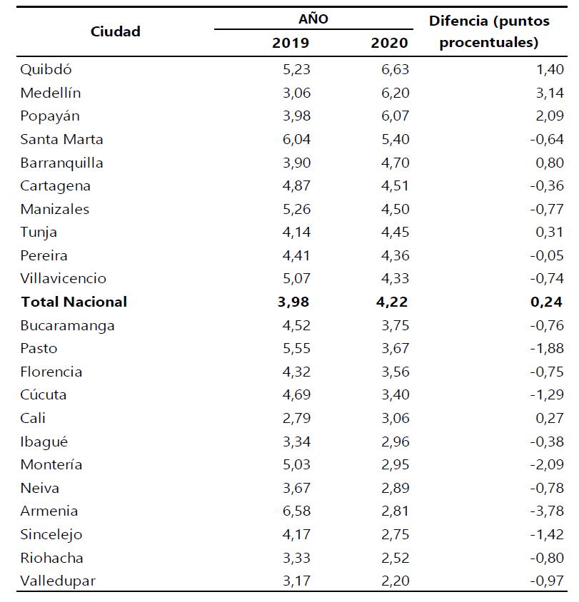 En contraste, dieciséis ciudades registraron variaciones inferiores en el 2020 respecto a las presentadas el año anterior, las diferencias más altas en puntos porcentuales fueron: Armenia (3,78 puntos porcentuales), Montería (2,09 puntos porcentuales), Pasto (1,88 puntos porcentuales) y Sincelejo (1,42 puntos porcentuales).
