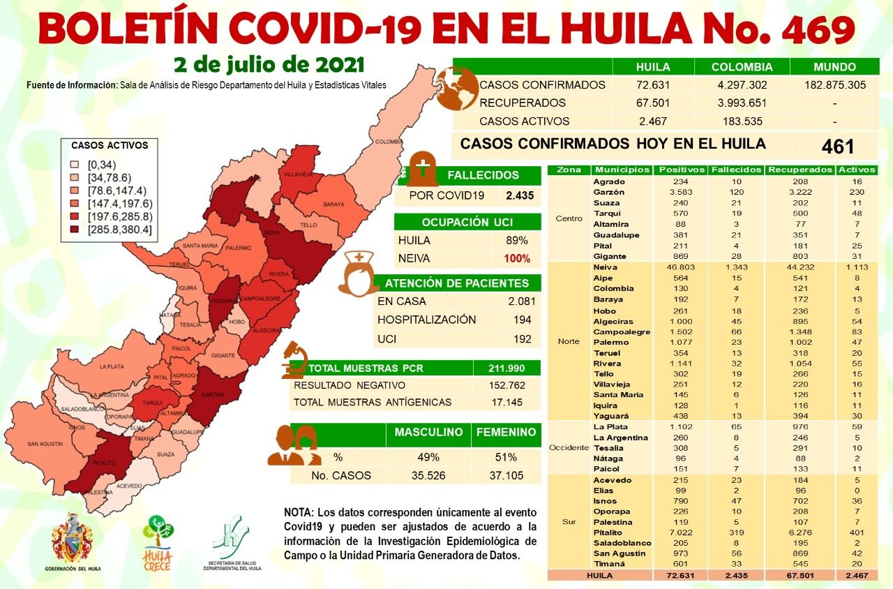 El Ministerio de Salud confirmó este viernes 461 casos nuevos de contagio del virus SarsCov2 en 29 municipios, distribuidos así: 227 casos en Neiva, 73 en Pitalito, 29 en Garzón, 12 en Campoalegre, 12 en Tarqui, 11 en Algeciras, 10 en Palermo, 9 en Rivera, 8 en Agrado, 8 en San Agustín, 7 en La Plata, 6 en Isnos, 6 en Yaguará, 5 en Iquira, 5 en El Pital, 4 en Gigante, 4 en Paicol, 4 en Timaná, 3 en Colombia, 3 en Hobo, 3 en Santa María, 3 en Teruel, 2 en Suaza, 2 en Tesalia, 1 en Acevedo, 1 en Aipe, 1 en Altamira, 1 en Palestina y 1 en Tello.