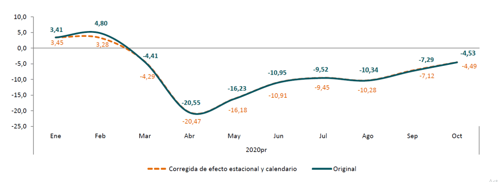 Esta cifra es la más baja presentada en medio de la pandemia y confirma así el proceso de reactivación, pues, en marzo, la crisis inició con una contracción de -4,42%, problemática que continúo en -20,55% durante abril, -16,23% en mayo, -10,95% en junio, -9,52% en julio, -10,34% en agosto, -75 en septiembre y -4,52% en octubre.