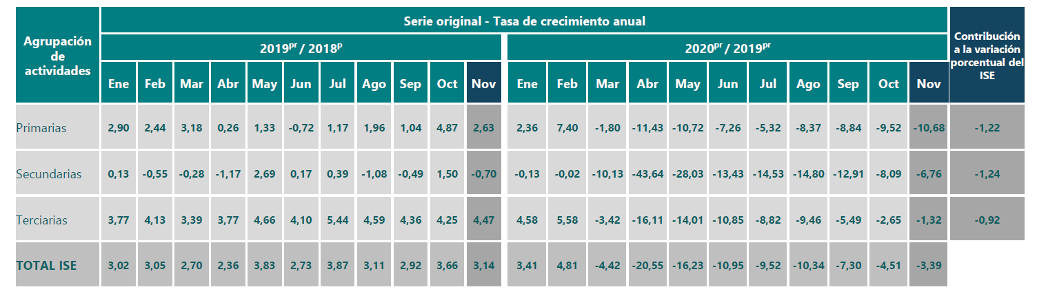 En su serie original, para noviembre de 2020, las actividades primarias (agropecuarias y explotación de minas y canteras) decrecieron 10,68% contribuyendo con -1,22 puntos porcentuales (pps) a la variación anual del ISE; las actividades secundarias (industrias manufactureras y construcción) decrecieron 6,76% y contribuyendo con -1,24 pps a la variación anual.