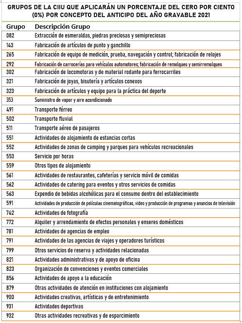 Las actividades económicas incluidas están dentro de sectores como la economía naranja, el turismo y el sector gastronómico. Los demás contribuyentes personas naturales y sucesiones ilíquidas del impuesto sobre la renta y complementarios que no desarrollen las actividades contenidas en el mismo calcularán el anticipo del impuesto sobre la renta del año gravable 2021 conforme con lo dispuesto en el artículo 807 del Estatuto Tributario.