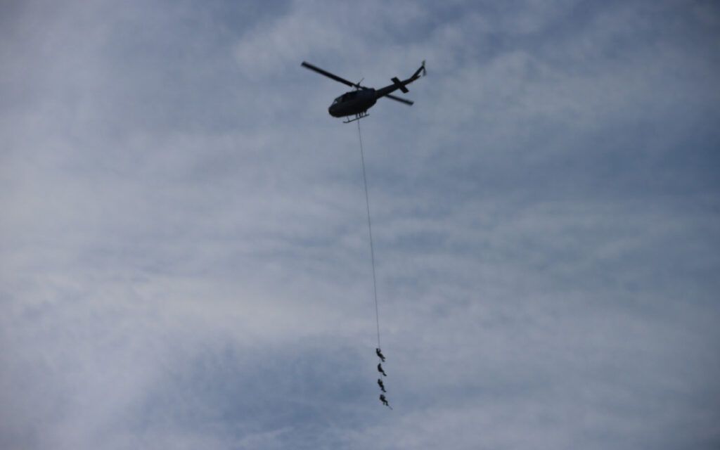 Durante las jornadas de instrucción, las tripulaciones de la aeronave Huey II ejecutaron procedimientos avanzados como STABO (Operaciones de Cuerpo Aéreo Estabilizado) y SPIE (Inserción o Extracción de Patrulla Especial), técnicas que permiten extraer personal en áreas donde no es posible realizar un aterrizaje.
