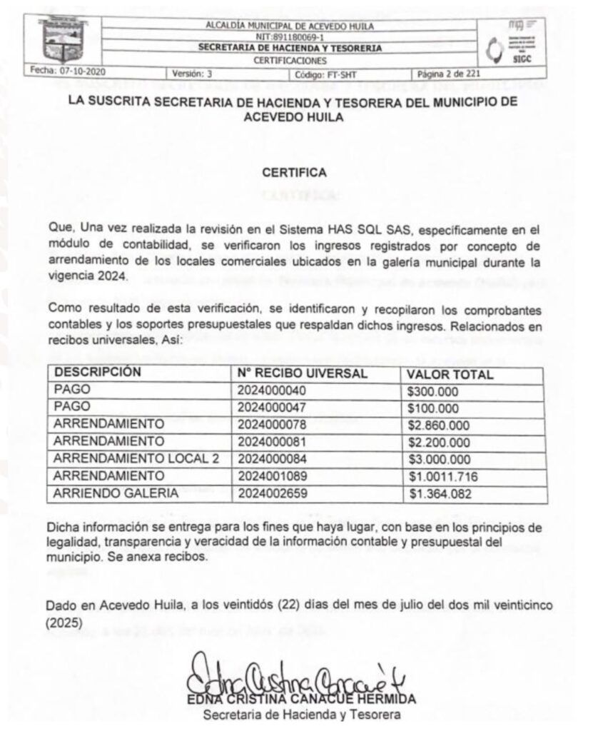 Durante la entrevista realizada el 2 de octubre de 2025, el exsecretario de Hacienda, Faiver Scarpeta Osorio, aseguró que el recaudo se hacía mediante talonarios consecutivos, cuyos comprobantes eran consignados en la cuenta No. 00-2 “Fondos Comunes” del Banco Agrario. Según esta versión, cada recibo incluía el nombre del arrendatario, el número del local y el valor pagado.