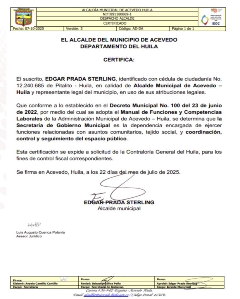 El ente de control ordenó al municipio de Acevedo la elaboración de un plan de mejoramiento que permita corregir las falencias detectadas y fortalecer los procesos internos. Además, dejó abierta la posibilidad de remitir la información a organismos como la Procuraduría y la Fiscalía para determinar responsabilidades individuales.