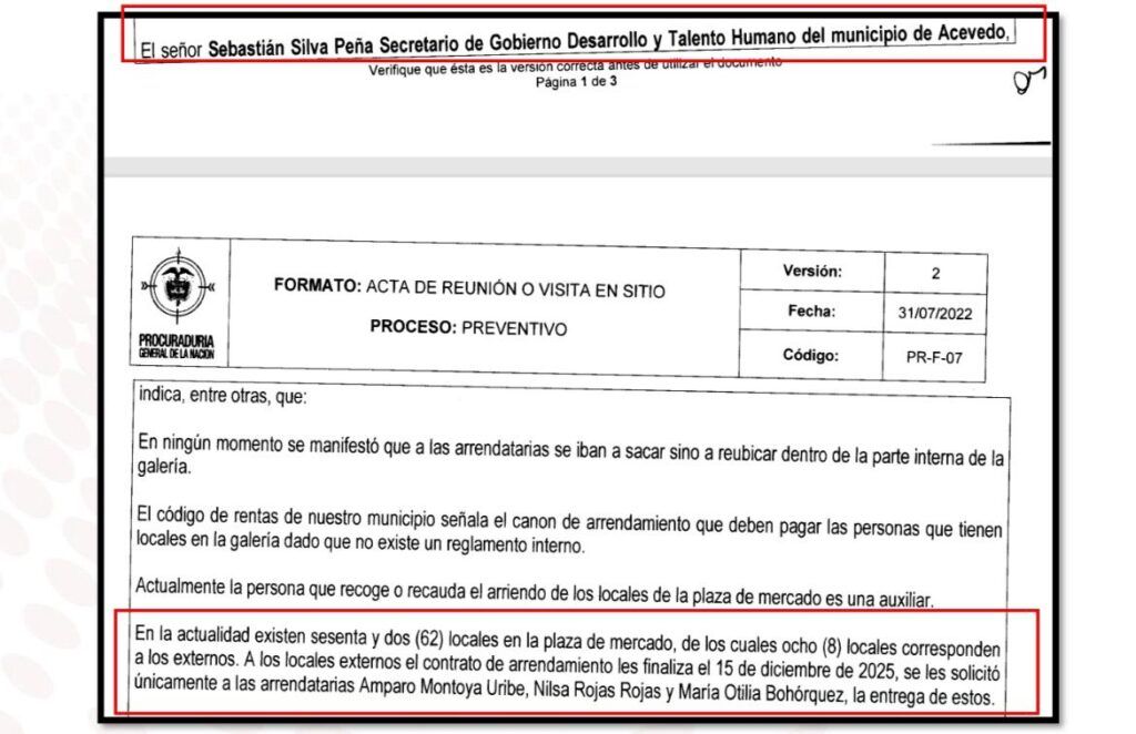 La actuación fiscalizadora se originó a partir de una denuncia presentada por el ciudadano Miguel Antonio López Gutiérrez, quien manifestó presuntas irregularidades en la administración de la plaza de mercado. El denunciante señaló a la Alcaldía de Acevedo por un presunto manejo inadecuado de los fondos públicos provenientes de los arrendamientos de la galería y por permitir que el secretario de Gobierno utilizara los recaudos como “plata de bolsillo”.