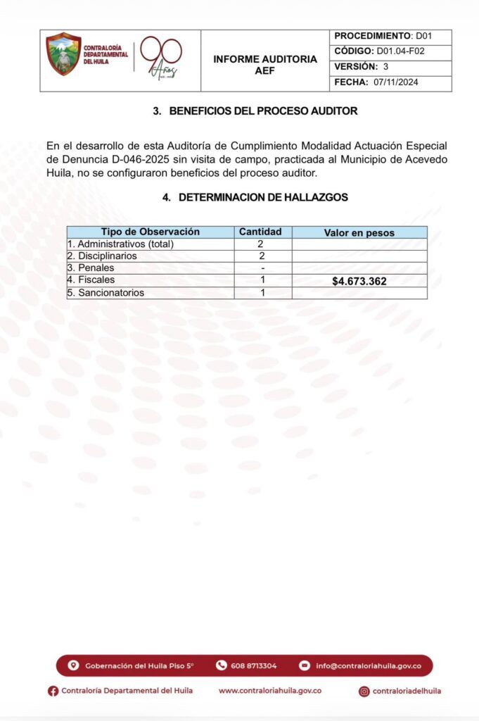 El informe definitivo advierte que la administración municipal no mantuvo registros, documentos ni expedientes contractuales que permitieran verificar la trazabilidad de los ingresos, el cumplimiento de los contratos y el destino de recursos claves para Acevedo. En conjunto, estos hallazgos dieron lugar a observaciones administrativas, disciplinarias y un posible hallazgo fiscal por pérdida de recursos públicos.
