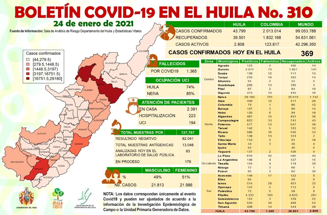 La Sala de Análisis del Riesgo del Huila confirmó 369 resultados positivos de covid-19,