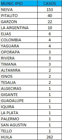 La Sala de Análisis del Riesgo del Huila confirmó este viernes 262 resultados positivos de Covid19, distribuidos así:
