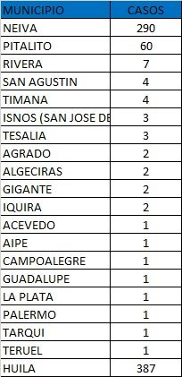 La Sala de Análisis del Riesgo del Huila confirmó 387 resultados positivos de Covid19, distribuidos así: 290 en la ciudad de Neiva, 60 en Pitalito, 7 en Rivera, 4 en San Agustín, 4 en Timaná, 3 en Isnos, 3 en Tesalia, 2 en Agrado, 2 en Algeciras, 2 en Gigante, 2 en Iquira, 1 en Acevedo, 1 en Aipe, 1 en Campoalegre, 1 en Guadalupe, 1 en La Plata, 1 en Palermo, 1 en Tarqui y 1 en Teruel.