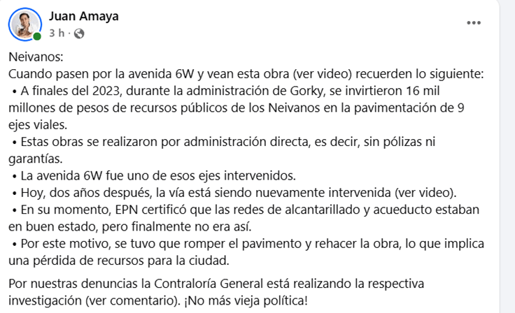 El concejal de Neiva Juan Diego Amaya cuestionó nuevamente el estado de la avenida 6W de Neiva, vía que hoy está siendo intervenida pese a haber sido pavimentada hace apenas dos años durante la administración de Gorky Muñoz.