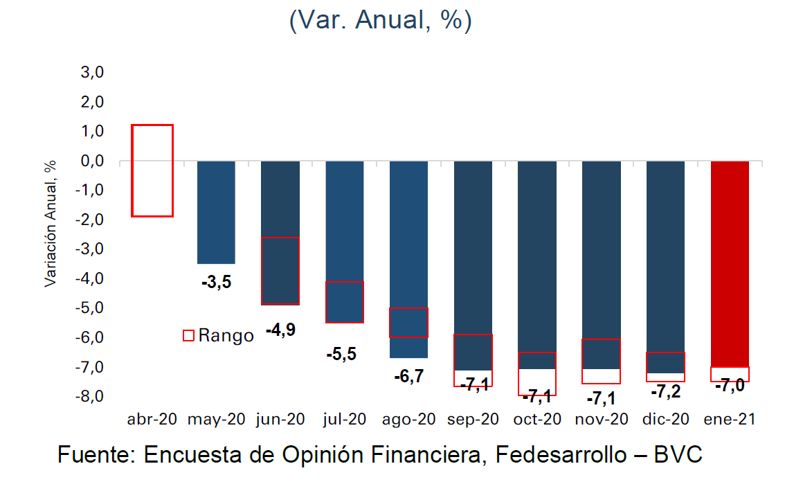El pronóstico de crecimiento para el primer mes del año 2020 se ubicó en un rango entre -7,2% y – 6,9%, con -7% como respuesta mediana. La mediana de los pronósticos para 2021 se ubicó en 4,4%, estando en un rango entre 3,5% y 4,95%.