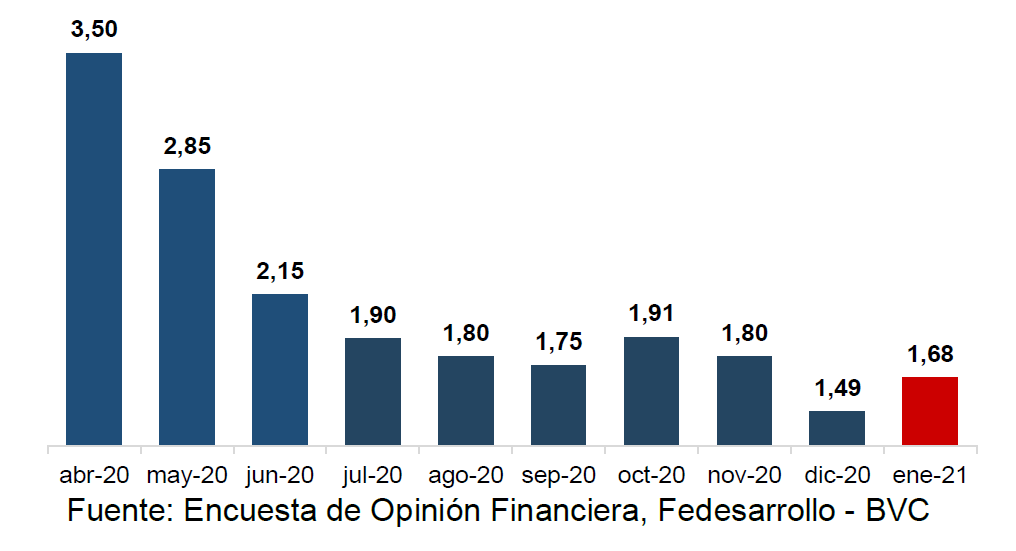 En diciembre la Junta Directiva del Banco de la República decidió mantener la tasa de interés de política monetaria en 1,75%. Para enero de 2021, el 97,7% de los analistas espera que la tasa se mantenga inalterada en 1,75%, mientras que el 2.3% espera una disminución de 25 pbs.