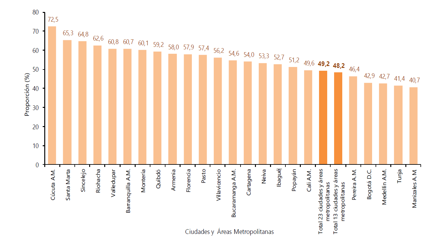 Cúcuta es la ciudad con las mayores cifras (72.5%), seguida de las principales ciudades de la región Caribe; Barranquilla presentó una tasa del 60,7%, muy por encima del promedio nacional. Neiva por su parte registró una tasa de informalidad en ascenso, mientras en el último trimestre de 2020 tuvo un 53,1% en esta oportunidad subió 0,2%, ubicándose en 53,3.