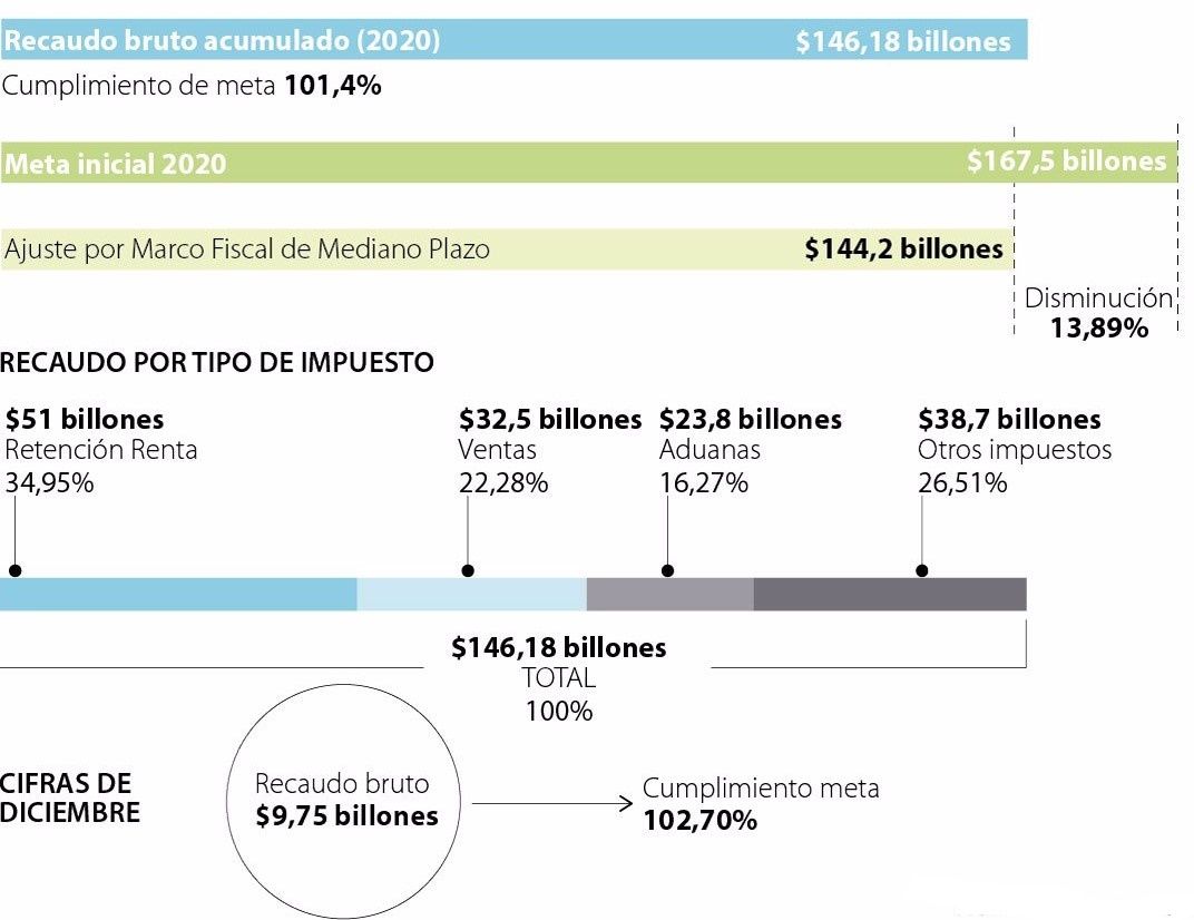La Dirección de Impuestos y Aduanas Nacionales, Dian, cumplió en un 101% su meta (ajustada) de recaudo de impuestos. El recaudo bruto acumulado en 2020 fue de $146,18 billones, lo que representa una caída de 7,4% frente a lo logrado en 2019, cuando se logró la suma de $157,87 billones. Pese al bajo monto, se destaca la leve disminución y el cumplimiento de la meta asignada, luego del ajuste como resultado del Marco Fiscal de mediano plazo, fue de 101,4%.