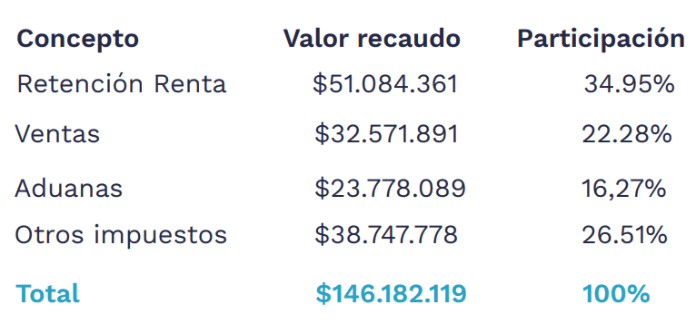 El 73,54% del recaudo correspondió a retención en la fuente a título de Renta, $51 billones, (representando una participación de 34,95% del total ), IVA ($32 billones) y tributos aduaneros (23 billones).