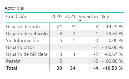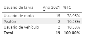 De las 24 víctimas en moto, 22 fueron hombres y dos mujeres, con rangos variados de edad, oscilando entre los 15 y los 30 años de edad, sumando así nueve víctimas. Del total, el 54,16% se accidentaron el sábado o domingo entre las seis de la tarde y las 8:59 de la noche.