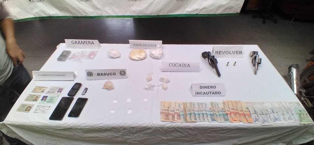 En los allanamientos realizados se logran hallar 2 armas de fuego tipo revolver calibre 38 largo con su respectiva munición en una caleta ubicada en una de las paredes de la vivienda, 3 motocicletas recuperadas las cuales figuraban con reporte de hurto, igualmente 400 gramos de base de coca, 250 gramos de bazuco, $1.042.000 de dinero en efectivo al parecer producto de la venta de estupefaciente, una gramera y bolsas para dosificación.