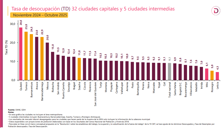En el total nacional la tasa de desocupación fue de 8,2 % para octubre de 2025. Un año atrás alcanzaba 9,1 %. Para las 13 ciudades y áreas metropolitanas la tasa fue de 8 %, mientras que en octubre de 2024 era de 9,5 %.