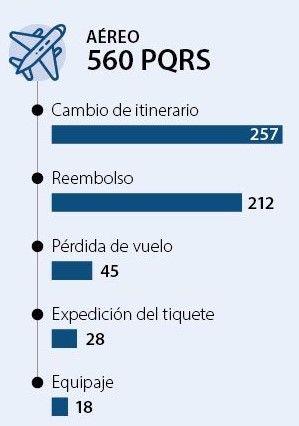 Por el servicio de transporte aéreo se registraron 560 quejas exactamente, de ellas 257 tienen relación con cambios de itinerarios y 212 por problemas con el reembolso de los tiquetes. Estos dos motivos representan el 83% del total de las quejas o peticiones realizadas durante los primeros 23 días de diciembre.