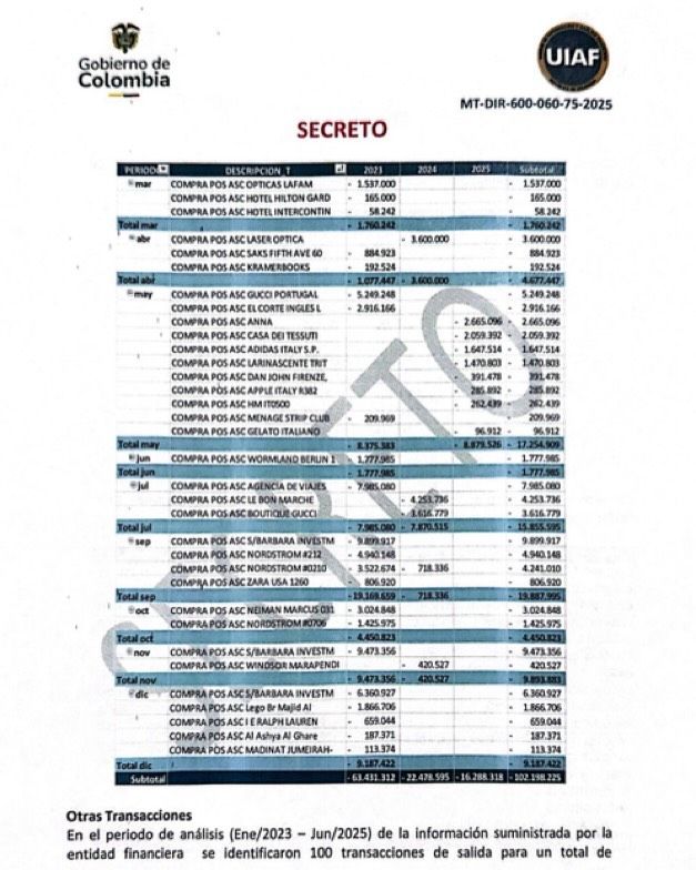 Un informe de la Unidad de Información y Análisis Financiero (UIAF) expone movimientos bancarios entre 2023 y 2025 del presidente Gustavo Petro, con desembolsos en marcas de lujo, pagos por entretenimiento en el extranjero y hasta una transferencia a un club para adultos en Portugal, lo que desata controversia entre sectores de la oposición y en redes sociales.
