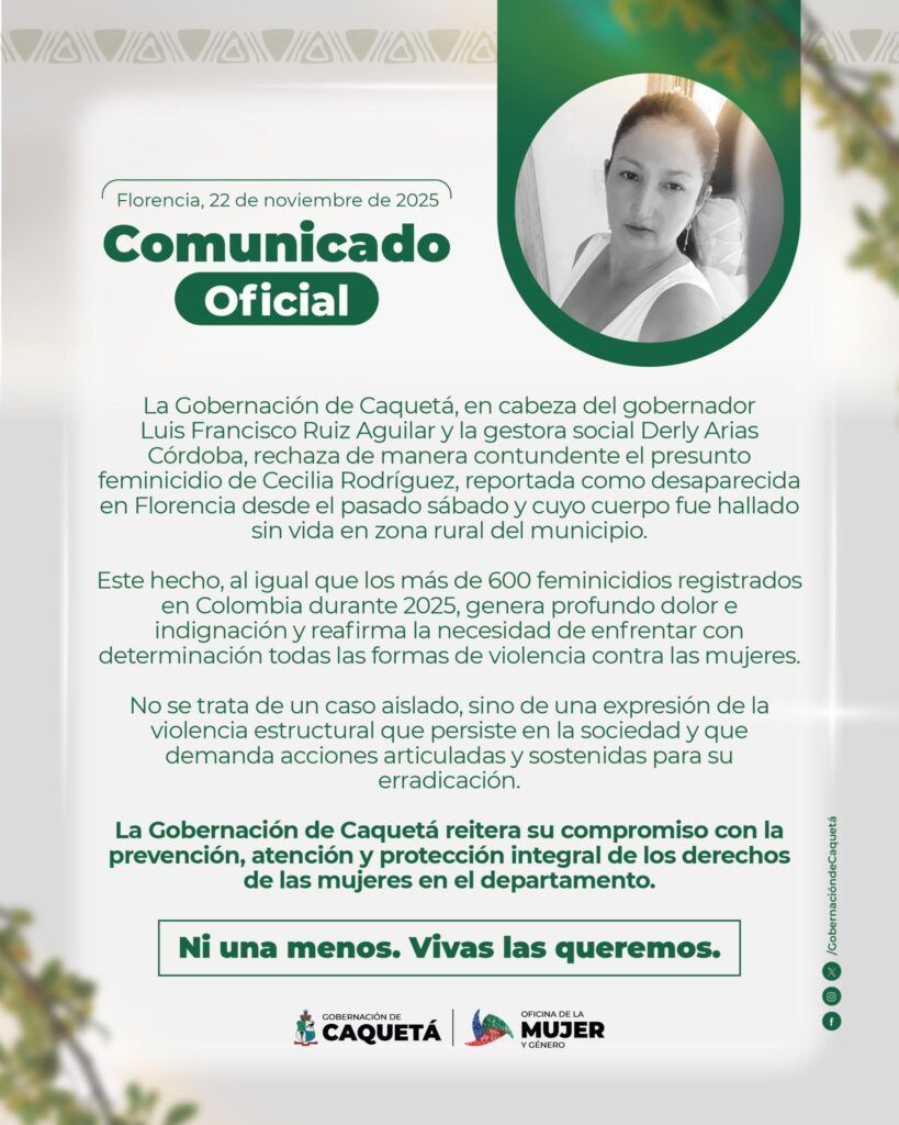 La Gobernación de Caquetá emitió un pronunciamiento tras conocerse el presunto feminicidio de Cecilia Rodríguez, quien había sido reportada como desaparecida desde el pasado sábado en Florencia y cuyo cuerpo fue hallado sin vida en zona rural del municipio.