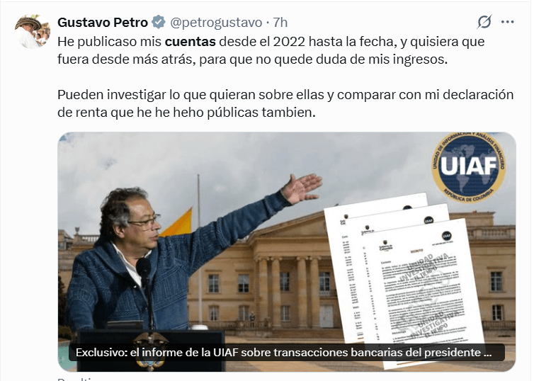 “He publicado mis cuentas desde el 2022 hasta la fecha, y quisiera que fuera desde más atrás, para que no quede duda de mis ingresos. Pueden investigar lo que quieran sobre ellas y comparar con mi declaración de renta que he hecho públicas también”,  manifestó el presidente Petro.